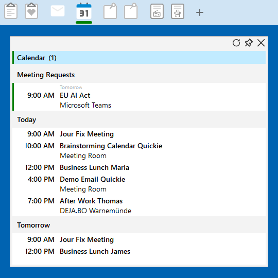 With the calendar quickie, your calendar is always just a click away. Click on the calendar icon in the assitant bar and you will see your pending meeting requests, all your appointments of the current day and the next days. Click on any appointment to open it on your desktop or web-based email client.