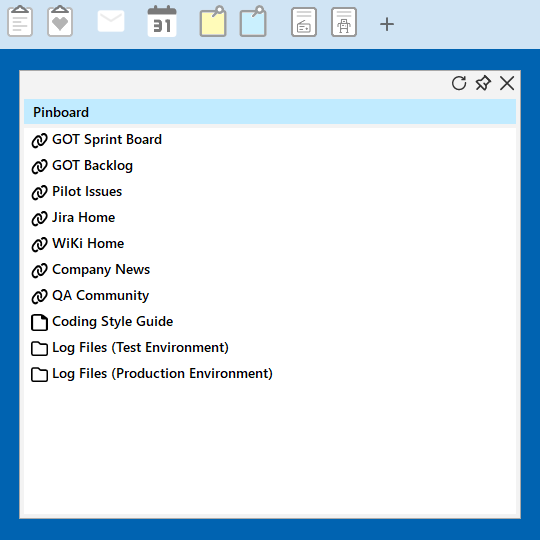 Are you on the shortlist for the Golden Raspberry Awards in the category "worst organized employee" because 100+ desktop tiles hide your desktop background image? If yes, and it sometimes annoys you, then here is a suggested solution: organize all your links, documents, folders, etc., in pinboards pinned to the assistant bar. Only one click to access a pinboard and another to open any pinned link, file, or folder.