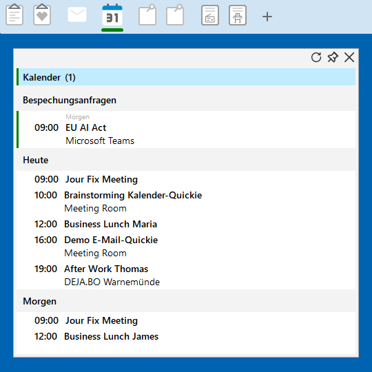 Mit dem Kalender-Quickie ist dein Kalender immer nur einen Klick entfernt. Klicke auf das Kalendersymbol in der Assistentenleiste und du siehst alle offenen Besprechungsanfragen und deine anstehenden Termine vom heutigen und den nächsten Tagen. Klicke auf einen beliebigen Termin, um ihn mit deinem Desktop oder webbasiertem E-Mail-Client zu öffnen.