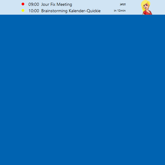 Schleiche dich nie wieder in ein Meeting, das bereits begonnen hat. Mit deiner persönlichen Kalenderanzeigetafel bleibst du über deine nächsten Termine stets auf dem Laufenden. Egal, ob du dich in einem Videoanruf im Vollbildmodus befindest, in einer Desktop-Anwendung arbeitest oder im Internet surfst, die Assistentenleiste mit der Kalenderanzeigetafel ist immer sichtbar.