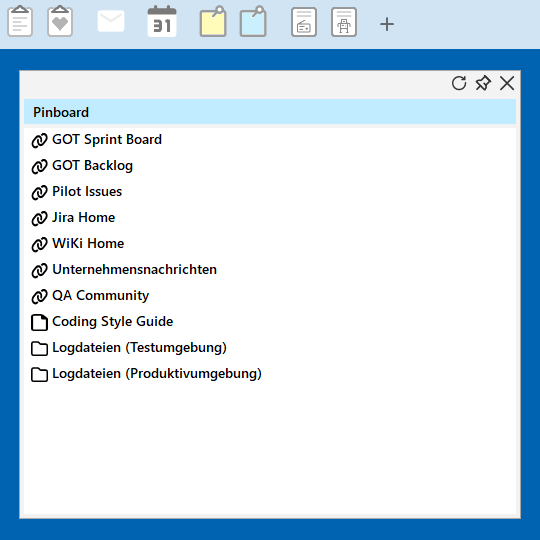 Stehst du auf der Shortlist für die Goldene Himbeere in der Kategorie „Am schlechtesten organisierter Mitarbeiter“, weil überabzählbar viele Desktop-Kacheln deinen Desktop-Hintergrund verdecken? Wenn ja, und es dich manchmal nervt, dann kommt hier ein Lösungsvorschlag: organisiere einfach alle deine Links, Dokumente, Ordner usw. in Pinnwänden auf deiner Assistentenleiste. Ein Klick genügt, um ein Pinnwand anzuzeigen und ein weiterer, um einen angehefteten Link, eine Datei oder einen Ordner zu öffnen.